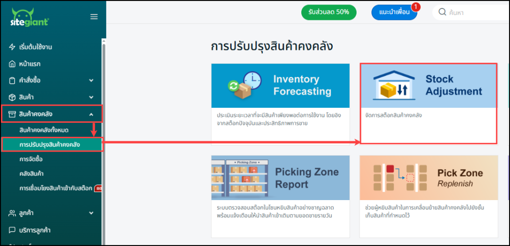 ขั้นตอนที่ 1: ไปที่เมนู สินค้าคงคลัง > การปรับปรุงสินค้าคงคลัง > การปรับสต็อก