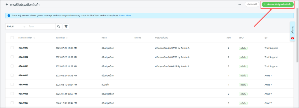 Step 2: Click on the + Add Stock Adjustment button. ขั้นตอนที่ 2: คลิกที่ปุ่ม + เพิ่มการปรับปรุงสต๊อกสินค้า