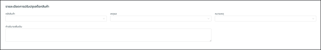 ขั้นตอนที่ 2: รายการสินค้าที่เลือกจะถูกเพิ่มไปยังหน้าปรับสต็อก ให้กรอกรายละเอียดการปรับสต็อก เช่น คลังสินค้า*, เหตุผล*, หมายเหตุ และบันทึกเพิ่มเติม