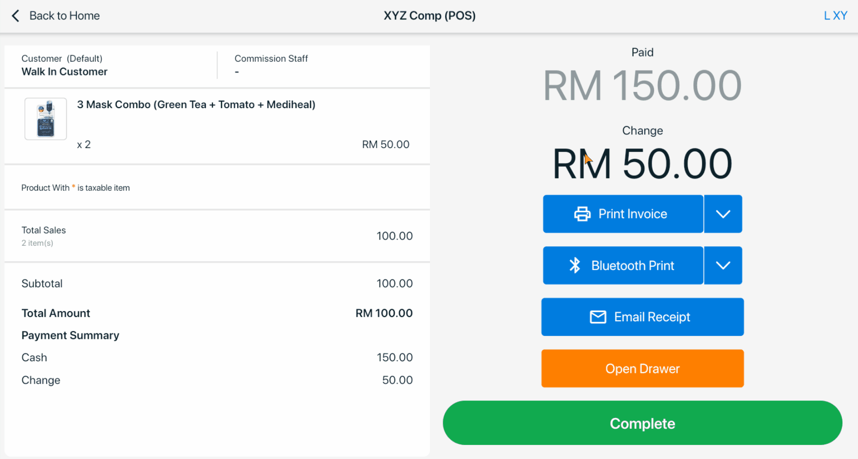 ขั้นตอนที่ 2: ระบบจะแสดงจำนวนเงินทอน คุณสามารถเลือกพิมพ์ใบเสร็จได้ผ่าน Print Invoice (A4), Bluetooth, Wi-Fi หรือ USB Print สำหรับเครื่องพิมพ์ใบเสร็จแบบความร้อน (58mm / 80mm) หรือสามารถส่งใบเสร็จผ่านอีเมล โดยกรอกอีเมลลูกค้า > นำไปใช้ เมื่อเสร็จแล้วคลิก เสร็จสิ้น