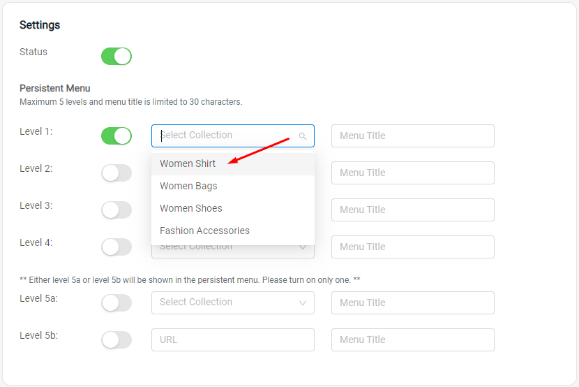 ขั้นตอนที่ 4: เลือก คอลเลกชัน สำหรับเมนู และเปิดใช้งานสถานะสำหรับแต่ละระดับ – วิธีจัดการคอลเลกชันสินค้า