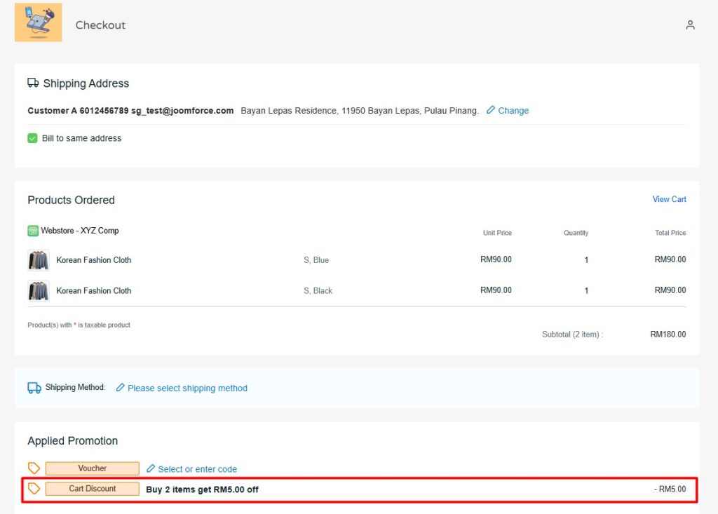 ขั้นตอนที่ 1: ในระหว่างการชำระเงิน ส่วนลดตะกร้าสินค้า จะถูกใช้โดยอัตโนมัติ หากลูกค้าซื้อถึงเกณฑ์ที่กำหนด