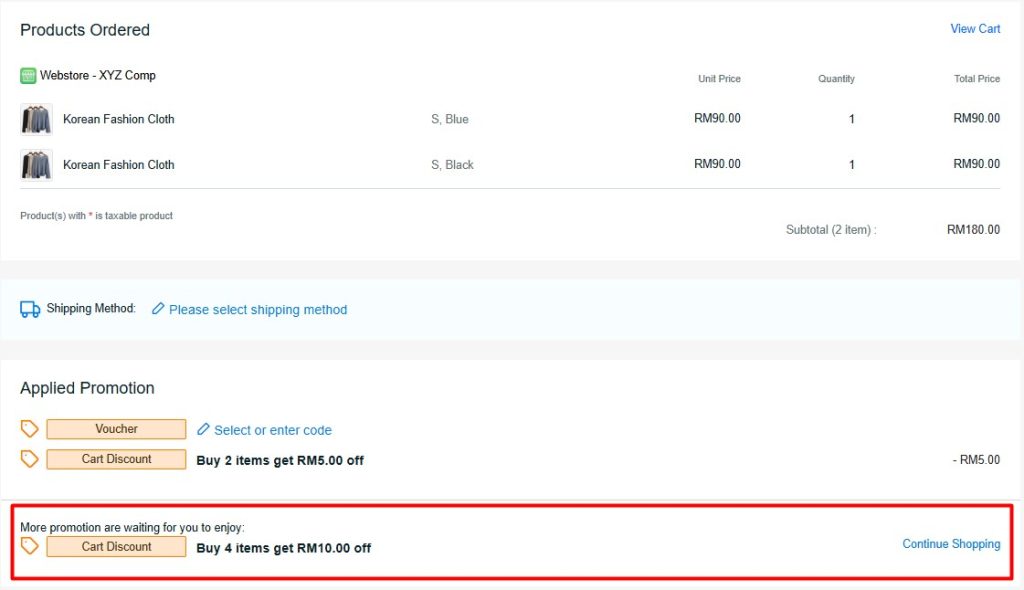 ขั้นตอนที่ 2: โปรโมชั่นเพิ่มเติม จะแสดงขึ้นเมื่อใกล้ถึงเกณฑ์การซื้อในระดับถัดไป ลูกค้าสามารถคลิก ช้อปปิ้งต่อ เพื่อเพิ่มสินค้าและปลดล็อกส่วนลดที่มากขึ้น