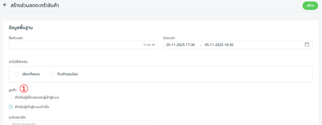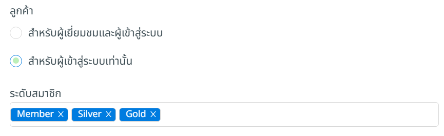 📌หมายเหตุ: หากคุณซื้อ SiteGiant OMO Pro ขึ้นไป คุณสามารถเลือกได้ว่าชั้นสมาชิกใดมีสิทธิ์ใช้ส่วนลดตะกร้าสินค้า เมื่อเลือกตัวเลือก เฉพาะผู้ที่เข้าสู่ระบบ (ไม่บังคับ)