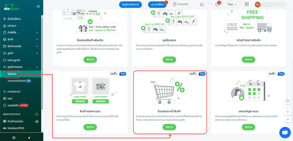 ขั้นตอนที่ 1: ไปที่ ศูนย์การตลาด บนแถบเมนูด้านข้าง > โปรโมชั่น > ส่วนลดตะกร้าสินค้า