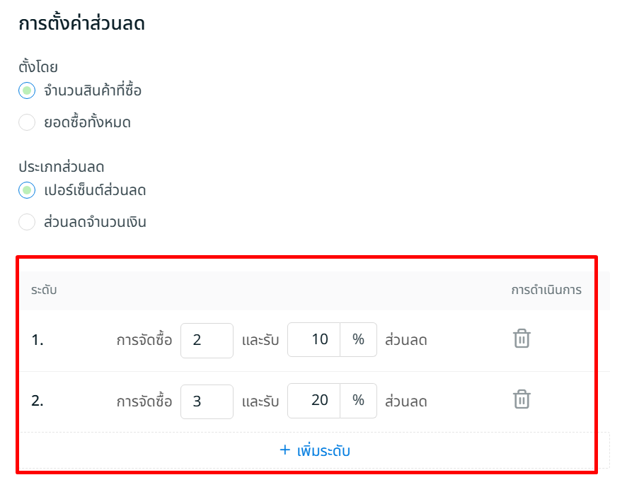ขั้นตอนที่ 4: เลือก การตั้งค่าส่วนลด สำหรับทั้ง ตั้งค่าโดย และ ประเภทส่วนลด โดยคุณสามารถเพิ่มได้สูงสุด 5 ระดับ ของส่วนลดตะกร้าสินค้า โดยแต่ละระดับต้องมีค่ามากกว่าระดับก่อนหน้า