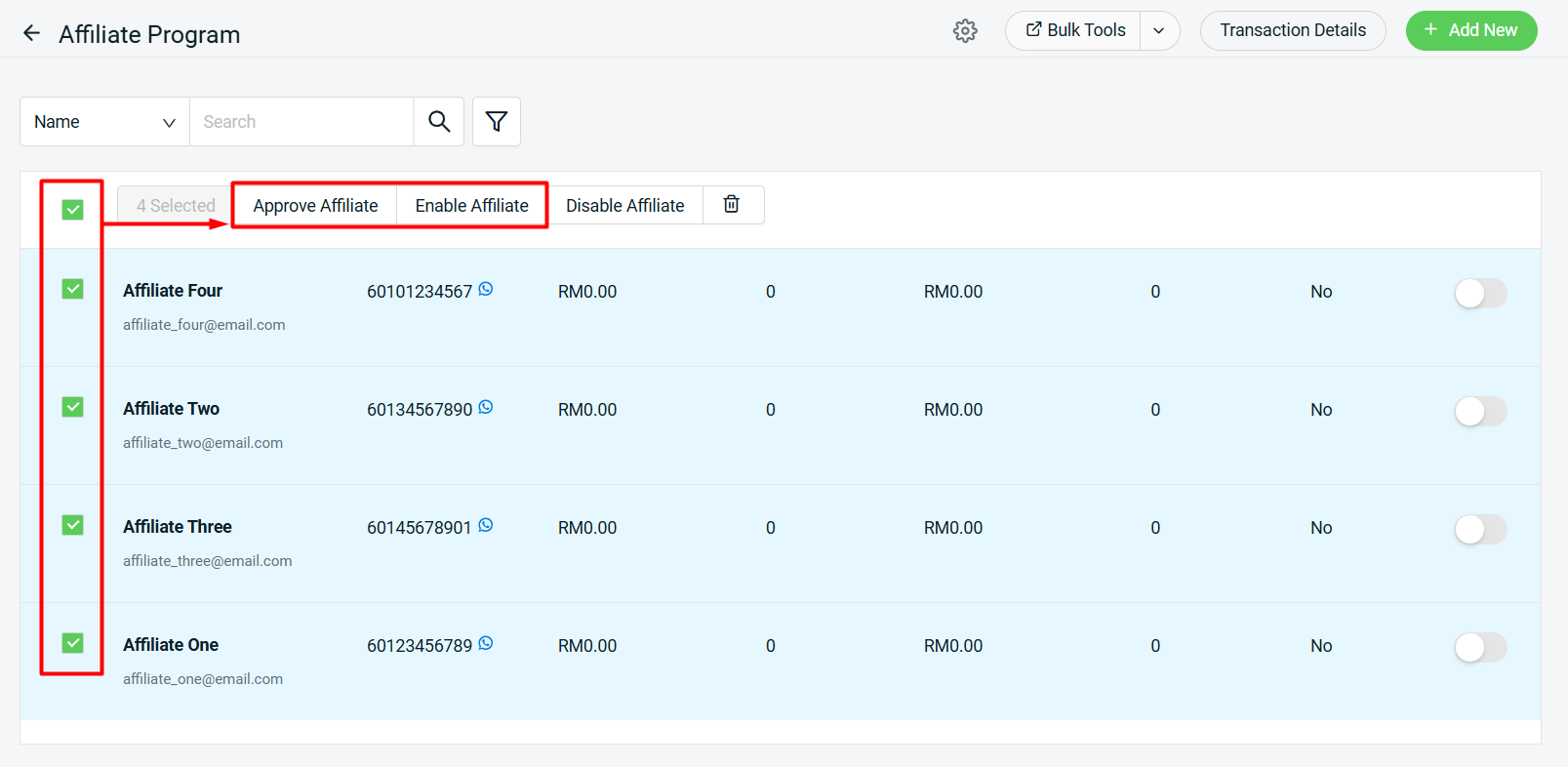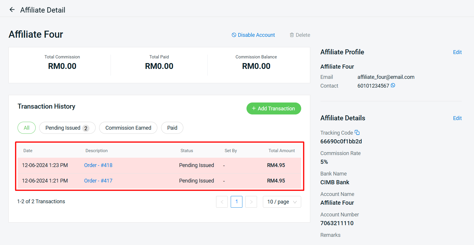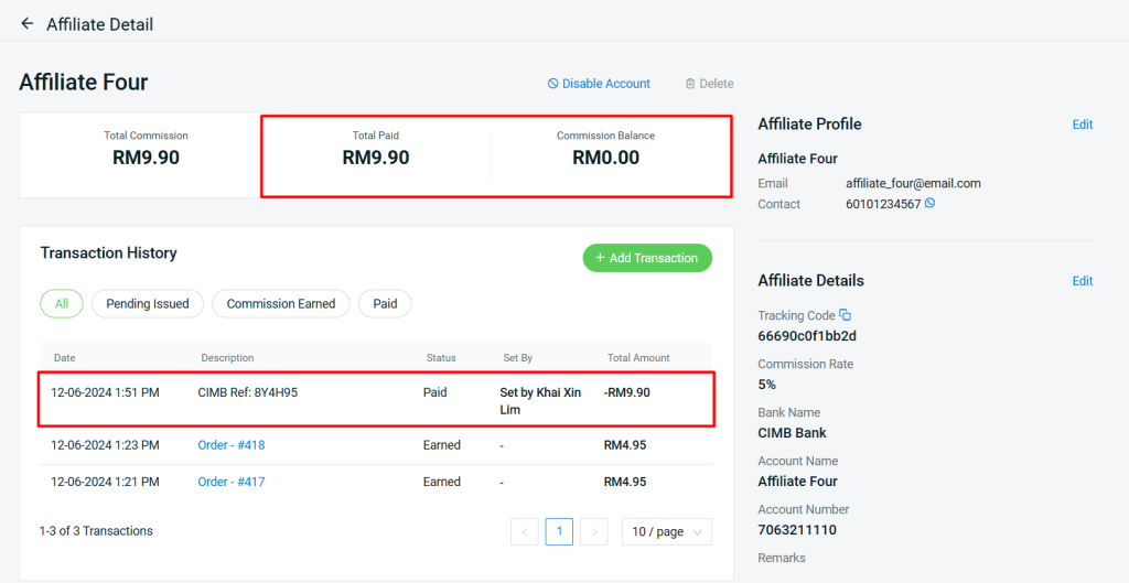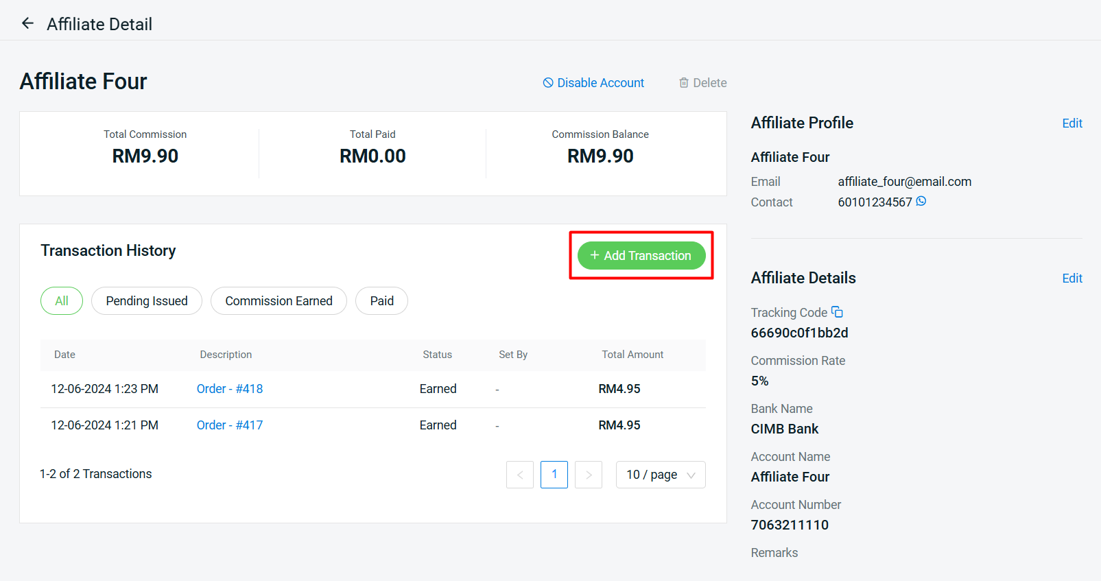 ขั้นตอนที่ 1: หลังจากคุณชำระเงินให้ Affiliate จำเป็นต้องตัดจำนวนค่าคอมมิชชั่นที่จ่ายแล้ว ไปที่ รายละเอียด Affiliate > + เพิ่มธุรกรรม