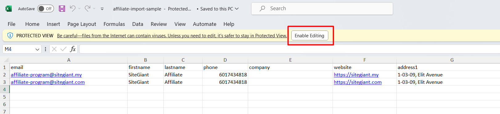 ขั้นตอนที่ 5: บันทึกไฟล์ Excel เมื่อแก้ไขเสร็จแล้ว กลับไปที่หน้า SiteGiant Affiliate Batch Create Tool > อัปโหลดไฟล์ Excel > ถัดไป
