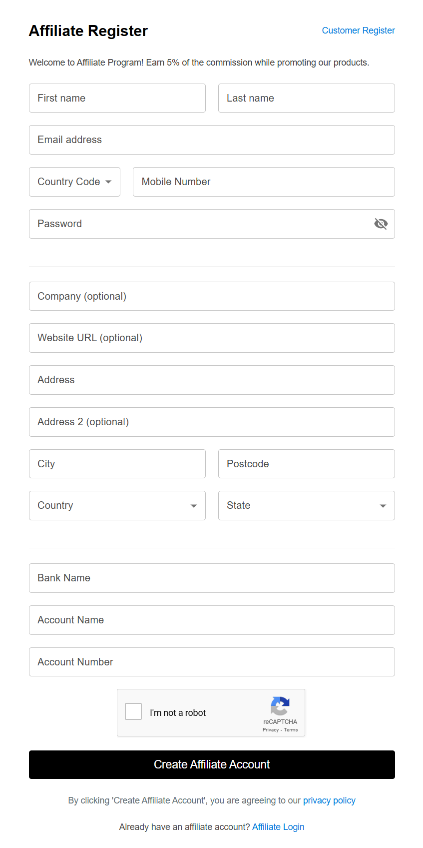ขั้นตอนที่ 2: กรอกแบบฟอร์ม การลงทะเบียนพันธมิตร > สร้างบัญชีพันธมิตร