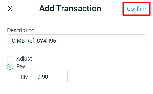 ขั้นตอนที่ 2: กรอก คำอธิบาย > เลือก ชำระเงิน และใส่จำนวนเงิน > ยืนยัน