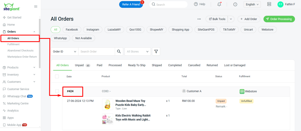 Step 1: Navigate to Orders > All Orders on the sidebar menu > click Order ID.