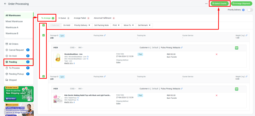 Step 3: Go to Pending section > To Arrange tab > select the Split order > Select Courier > then, you may arrange shipment for these orders as usual.