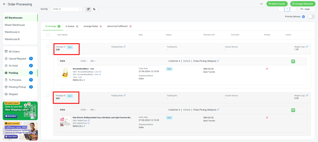 Step 2: A new Package ID will be generated for the split order under the Pending section.