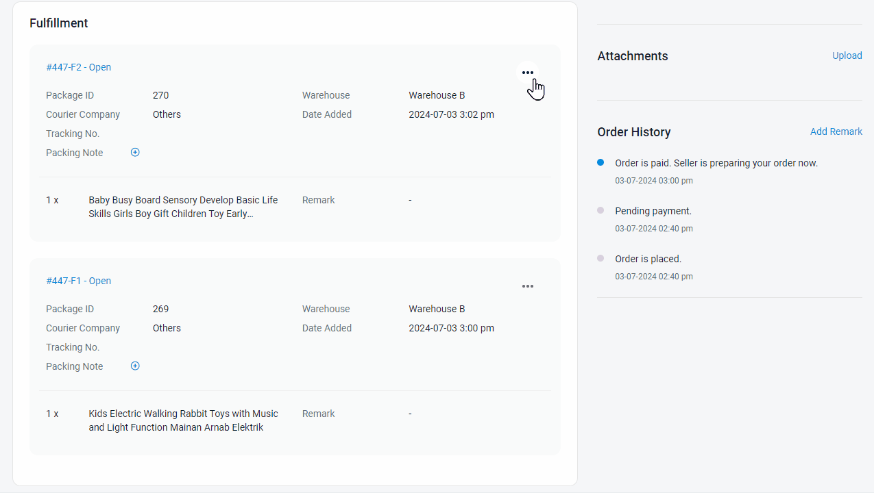 📌Note: - You are not able to Split or Merge the cancelled Fulfillment ID already. - If you cancel the Fulfillment ID after arrange shipment, order will appear under 'Abnormal Fulfillment' in Order Processing Page. - However, once updated to Cancelled, a new Fulfillment ID will be created and marked as Open(Refer video above). You can then proceed to arrange shipment for the order again.