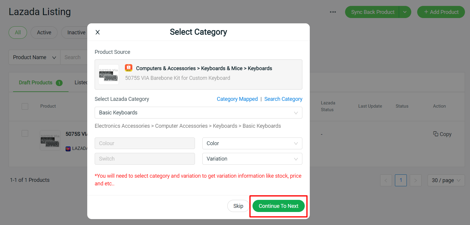 ขั้นตอนที่ 8: สินค้าทั้งหมดที่คัดลอกจะปรากฏในแท็บ แบบร่างสินค้า > คลิกที่ชื่อสินค้าเพื่อทำการจับคู่หมวดหมู่และข้อมูลตัวเลือกสินค้า