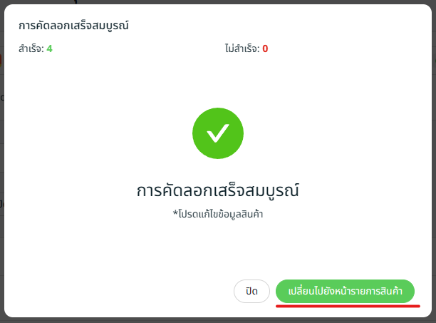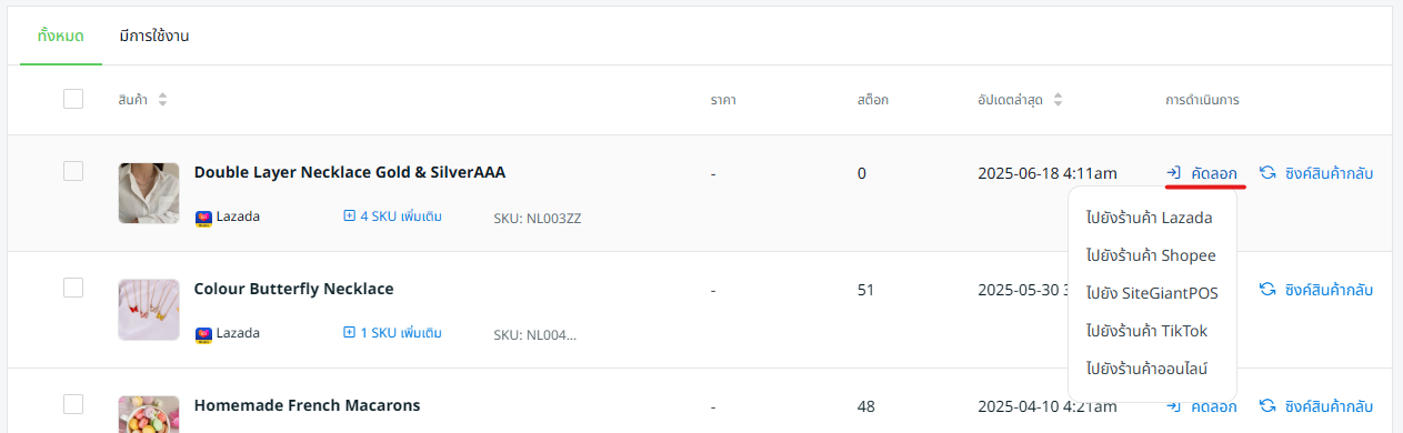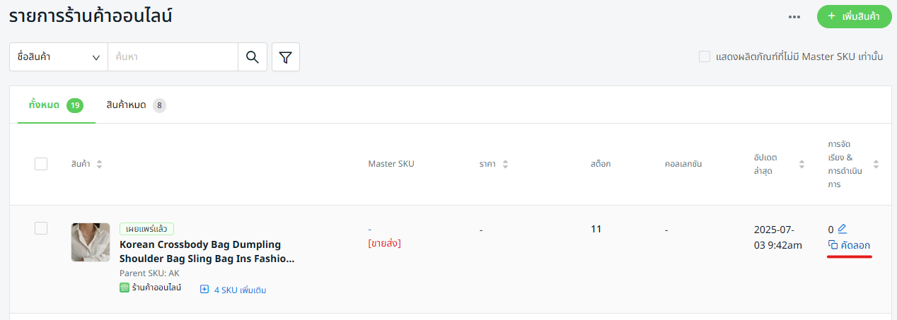 คัดลอก: สินค้าจะถูกคัดลอกเป็นสินค้าใหม่ แม้ว่าจะมี Parent SKU หรือชื่อสินค้าซ้ำก็ตาม