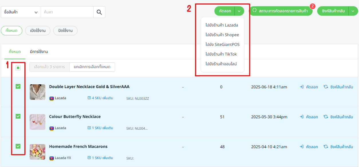 📌 หมายเหตุ: ช่องทางการขายบางรายการจำเป็นต้องดำเนินการคัดลอกคำสั่ง (Copy Action) โดยเฉพาะ เช่น การคัดลอกรายการสินค้าจาก Webstore ไปยัง Webstore หรือ Webstore ไปยัง TikTok หากต้องการดำเนินการดังกล่าว ให้ไปที่เมนู สินค้า > รายการร้านค้าออนไลน์ > คลิกที่ปุ่ม คัดลอก แล้วทำการคัดลอกรายการสินค้าจากที่นั่น