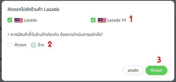 ขั้นตอนที่ 5: เลือกร้านค้าที่คุณต้องการคัดลอกสินค้า โดยระบบรองรับการคัดลอกไปยังหลายร้านค้าภายใน Marketplace เดียวกัน > เลือกว่าจะให้ระบบ คัดลอก หรือ ข้าม หากพบว่าสินค้ามีอยู่ในร้านนั้นแล้ว > จากนั้นคลิกปุ่ม คัดลอก