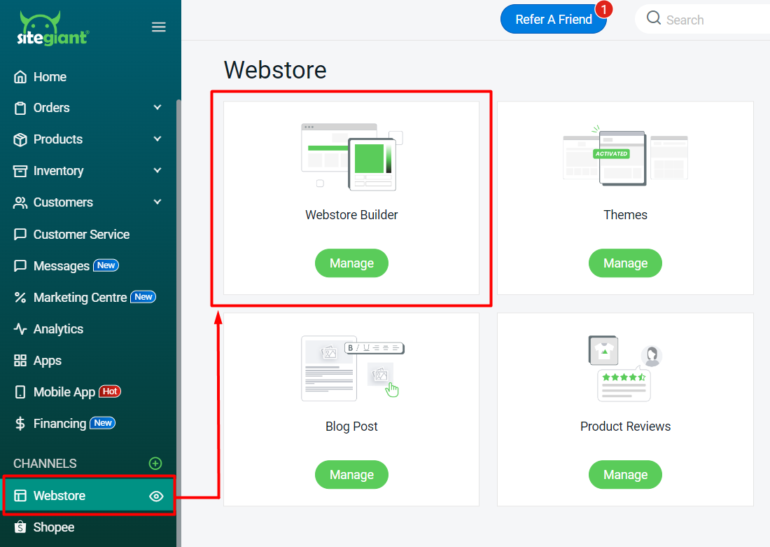 ขั้นตอนที่ 1: ไปที่ ช่องทาง Webstore บนเมนูด้านข้าง > ตัวสร้าง Webstore
