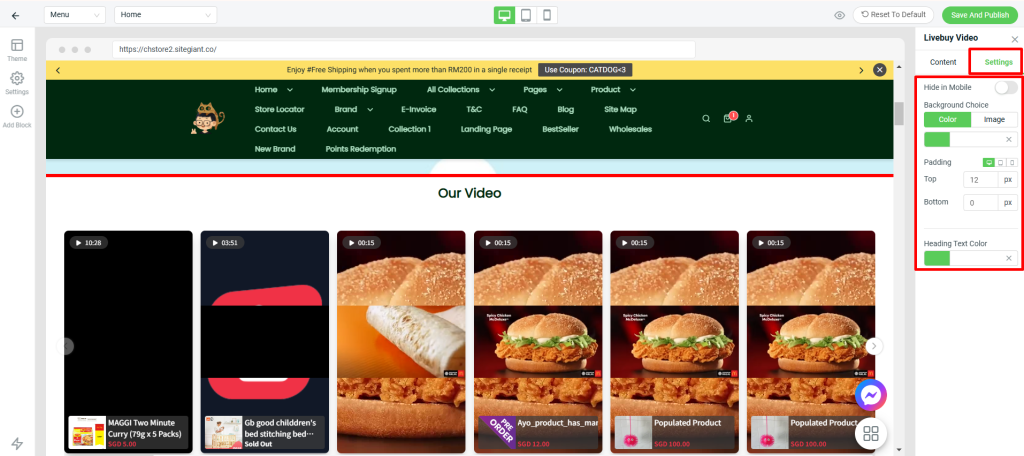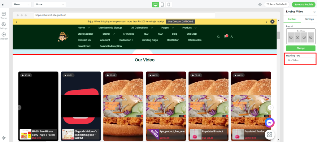 📌หมายเหตุ: เมื่อมีการเพิ่มวิดีโอ Short และ Live ลงใน Livebuy portal (พอร์ทัล Livebuy) วิดีโอนั้นจะแสดงในบล็อกของ Webstore Builder Livebuy