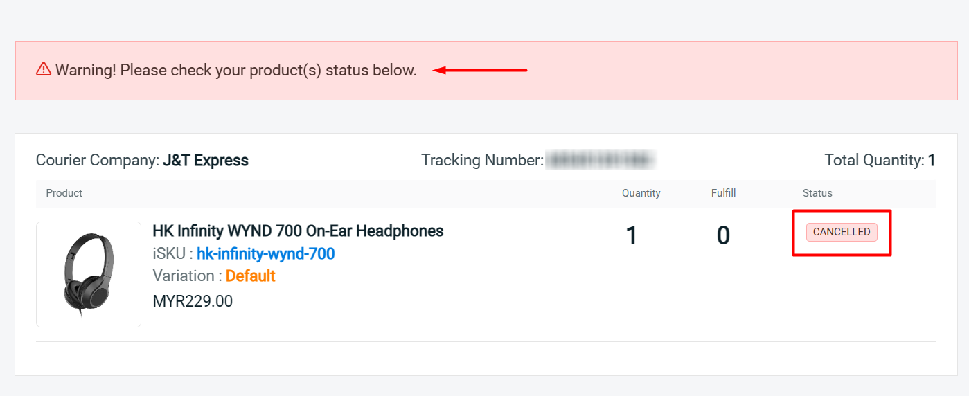 Step 4: If the order has already been cancelled, the warning message will be shown.