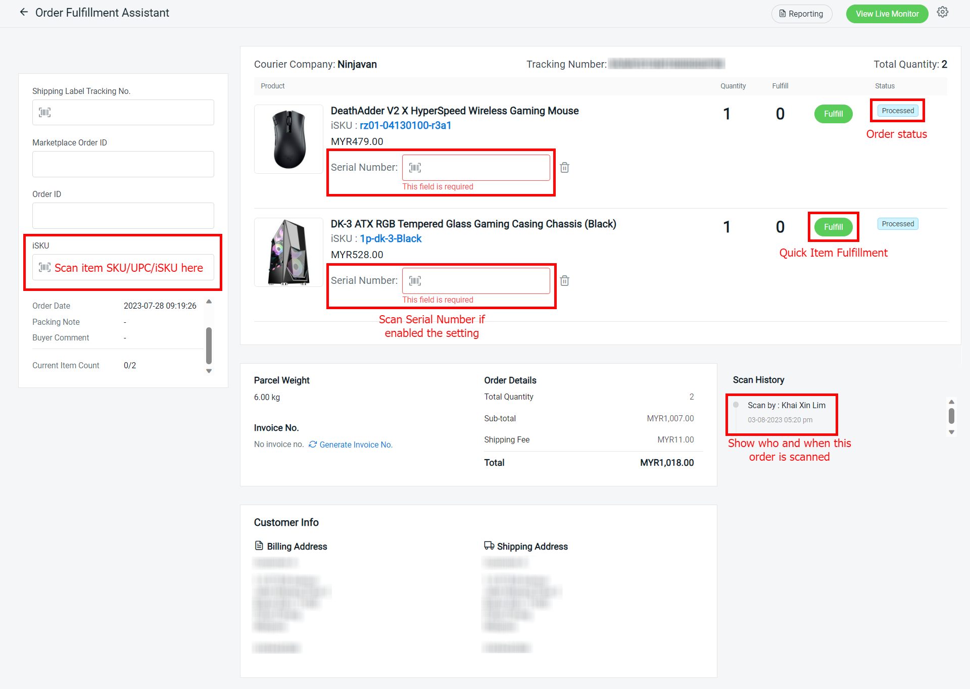 Step 2: The order details and products will be shown > if Scan Item is enabled, you may scan the item SKU/ UPC/ iSKU to double-check correct items are being picked > scan the serial number if it is enabled in the settings.