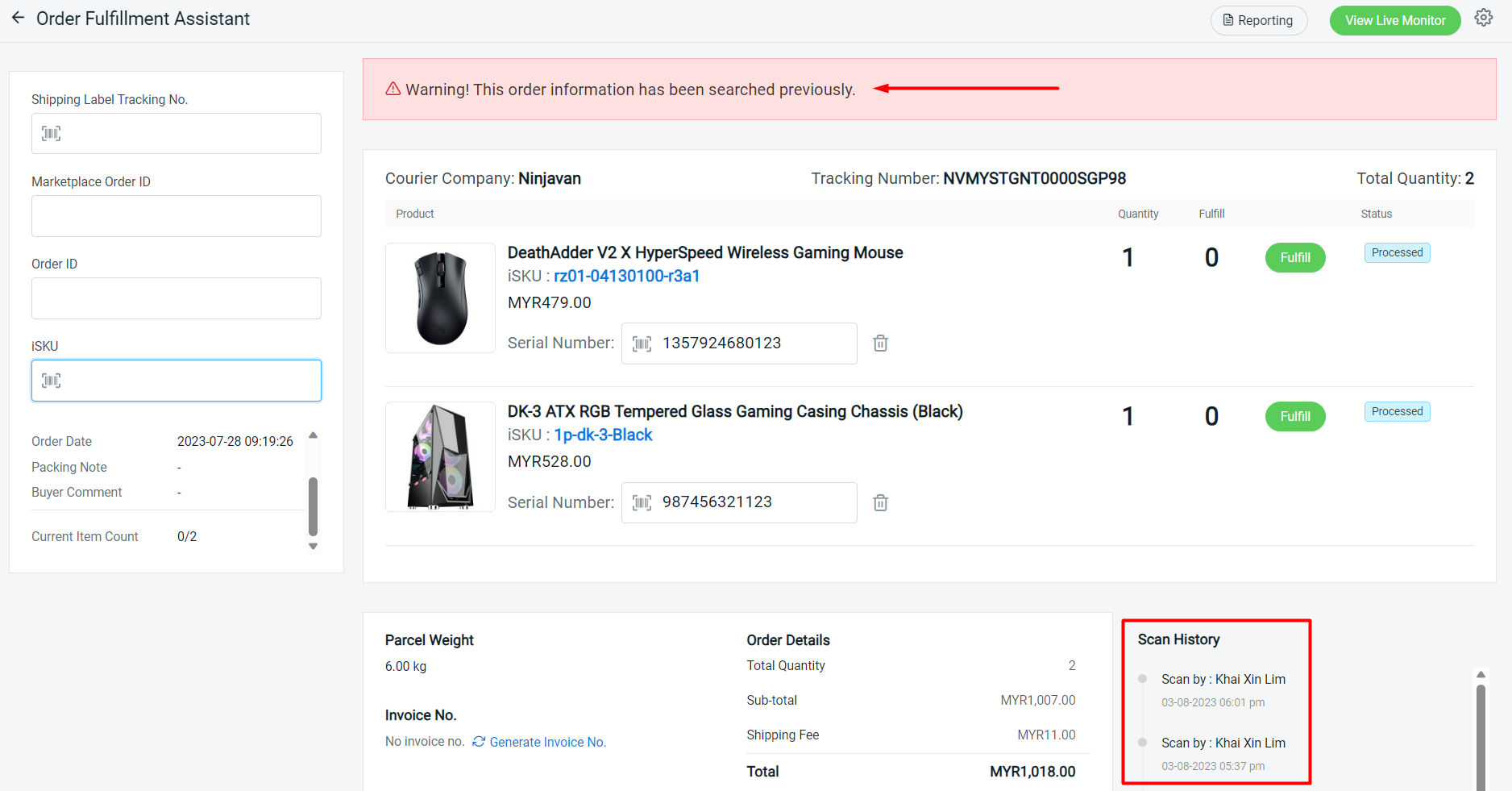 Step 3: A warning message with a beep sound will appear if the order is scanned before. Under Scan History, you may also identify the other user who has scanned the order previously.