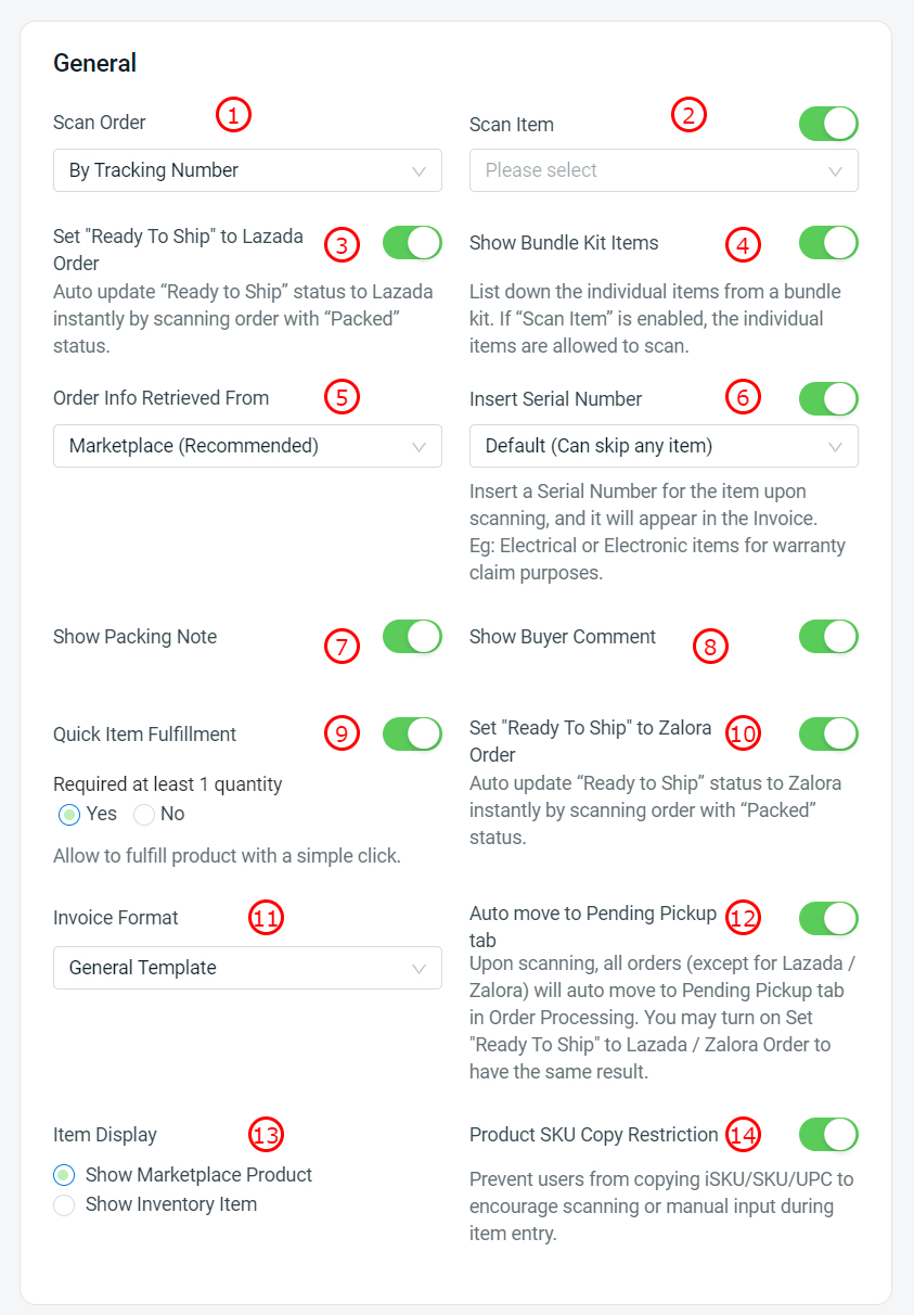 2. Scan Item: Enable to allow the scanning of item to double-check the correct items are picked (By SiteGiant iSKU, UPC or Marketplace SKU).
