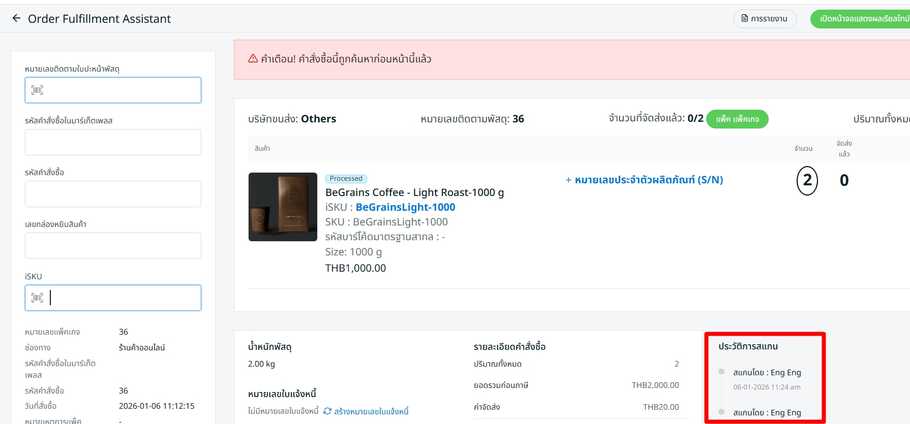 ขั้นตอนที่ 3: หากคำสั่งซื้อเคยถูกสแกนแล้ว ระบบจะแสดงข้อความเตือนพร้อมเสียงแจ้งเตือน และสามารถตรวจสอบประวัติการสแกนได้