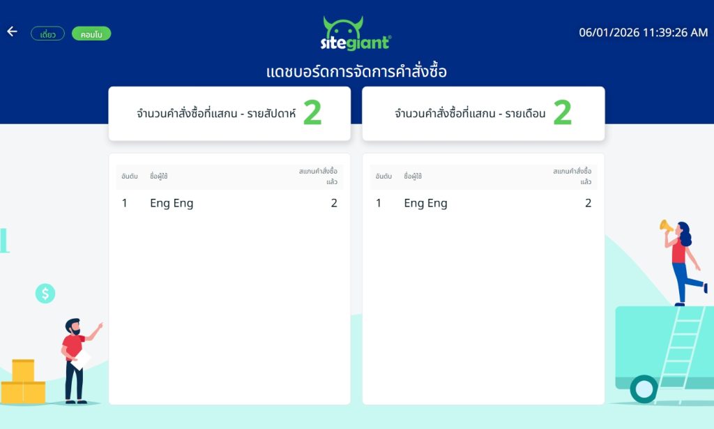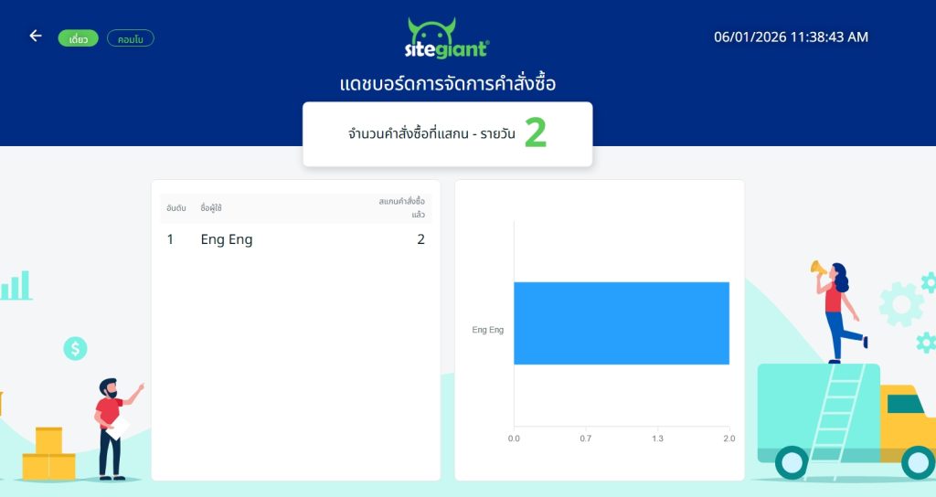 ด้วย SiteGiant Order Fulfillment Assistant คุณสามารถตรวจสอบสถานะคำสั่งซื้อจากมาร์เกตเพลสก่อนเริ่มแพ็คสินค้า และระบบจะแสดงข้อความแจ้งเตือนเมื่อสแกนสินค้าที่ไม่ถูกต้องสำหรับคำสั่งซื้อนั้น นอกจากนี้ คุณยังสามารถติดตามและให้รางวัลผลการทำงานของพนักงานได้ โดยตรวจสอบจำนวนคำสั่งซื้อที่แพ็คและประสิทธิภาพการทำงานของพนักงาน