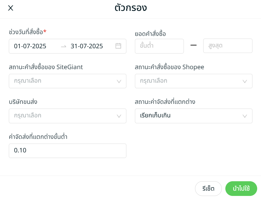 ขั้นตอนที่ 2: ในการกรองคำสั่งซื้อที่ถูกเรียกเก็บค่าจัดส่งเกิน ให้กรองตามช่วงวันที่ > เลือก “เรียกเก็บเกิน” ภายใต้สถานะค่าจัดส่งที่แตกต่าง > ใส่จำนวนเงินในช่อง ค่าจัดส่งที่แตกต่างขั้นต่ำ (เช่น 0.10) เพื่อกรองคำสั่งซื้อที่มีค่าจัดส่งแตกต่างมากกว่าค่านี้ > กด นำไปใช้