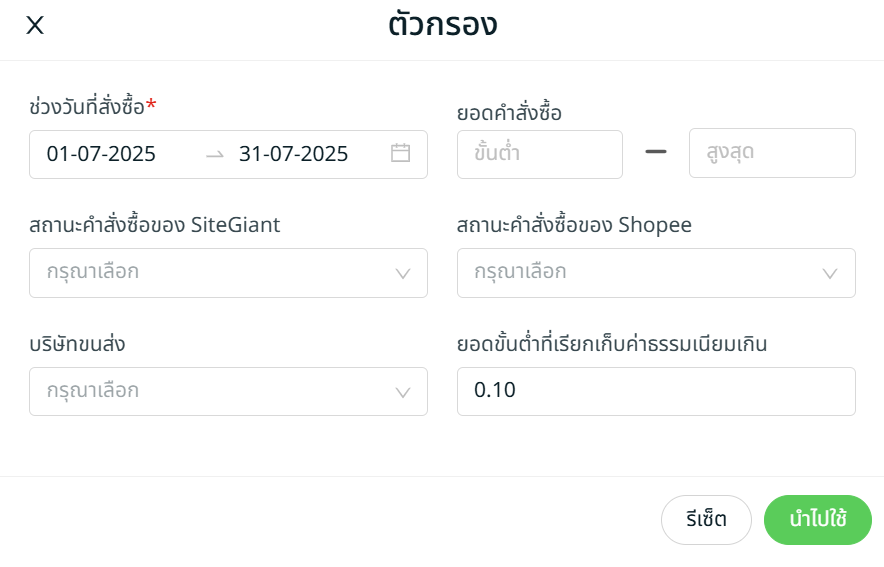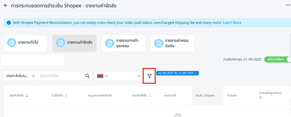 ในรายงานค่าจัดส่ง คุณสามารถกรองคำสั่งซื้อที่ถูกเรียกเก็บค่าจัดส่งเกินโดย Shopee ได้