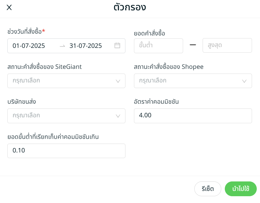ขั้นตอนที่ 2: กรองตามช่วงวันที่ > กำหนดอัตราค่าคอมมิชชั่นของร้าน Shopee ของคุณ (เช่น 4) ในช่อง อัตราค่าคอมมิชชัน > ใส่จำนวนเงินขั้นต่ำที่ยอมรับได้สำหรับค่าคอมมิชชั่นที่ถูกเรียกเก็บเกิน (เช่น 0.10) > กด นำไปใช้