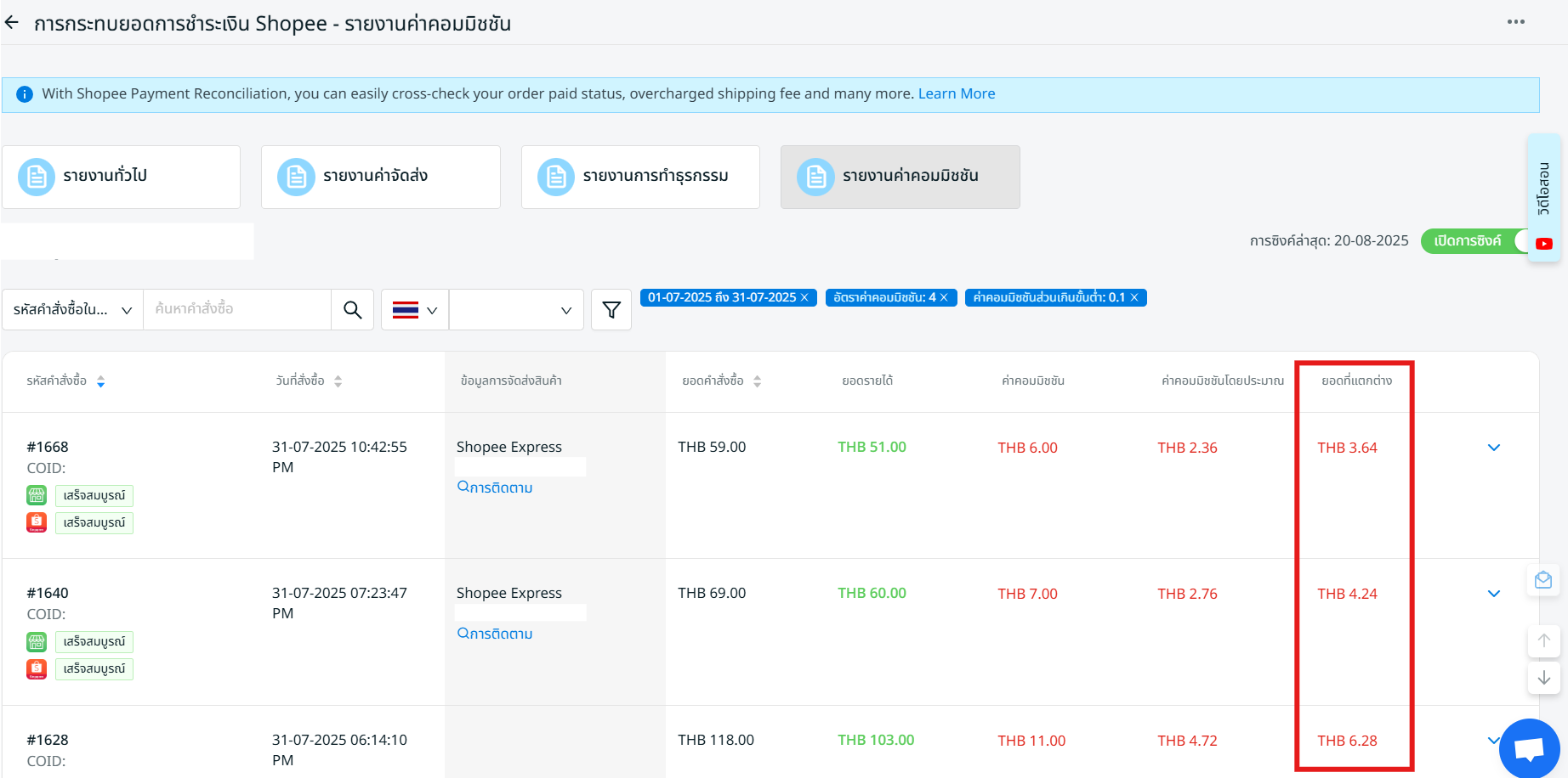 ขั้นตอนที่ 3: หากมีค่าคอมมิชชั่นที่ถูกเรียกเก็บเกิน จะแสดงเป็นสีแดง (RED) ในคอลัมน์ ยอดที่แตกต่าง