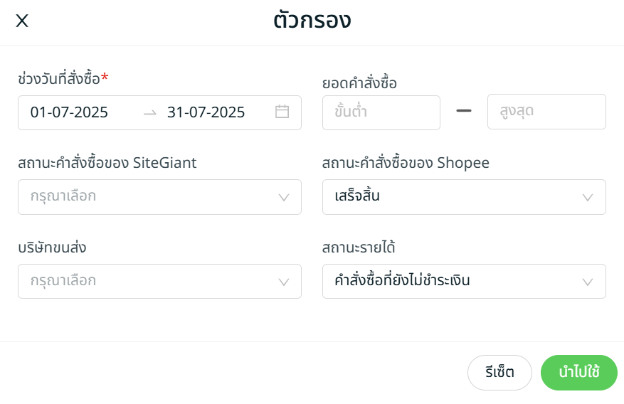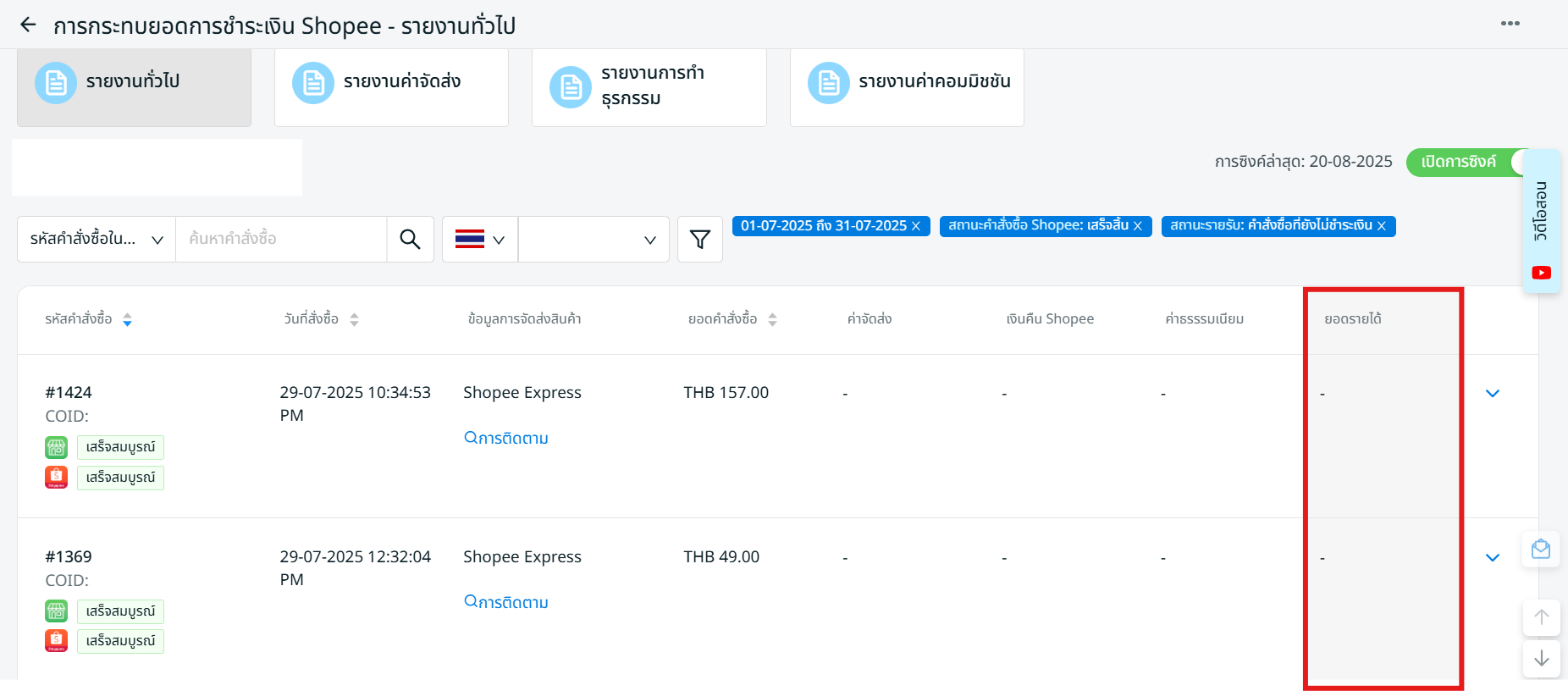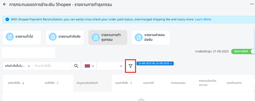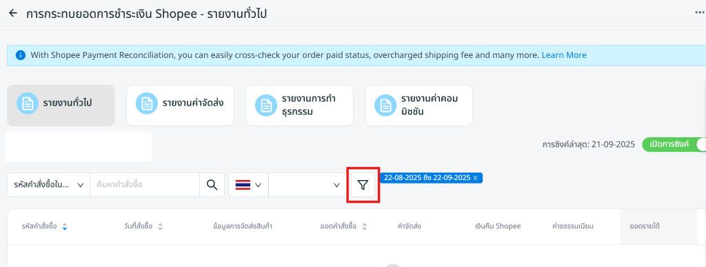 ในรายงานทั่วไป คุณสามารถ กรองคำสั่งซื้อที่มีการชำระเงินแล้วหรือยังไม่ได้รับการชำระเงินจาก Shopee ได้