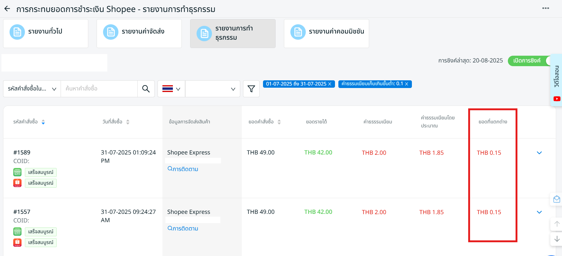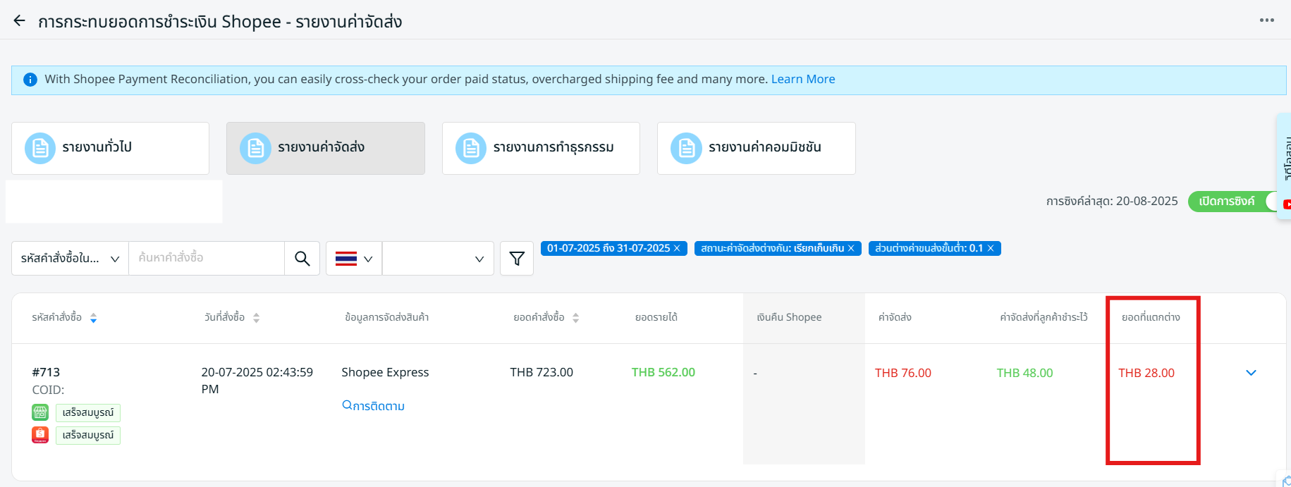 ขั้นตอนที่ 3: ค่าจัดส่งที่ถูกเรียกเก็บเกินจะแสดงเป็นสีแดง (RED) ในคอลัมน์ ยอดที่แตกต่าง