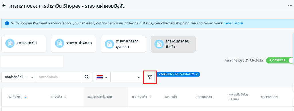 ในรายงานค่าคอมมิชชั่น (Commission Report) คุณสามารถกรองคำสั่งซื้อที่ถูกเรียกเก็บค่าคอมมิชชั่นเกินได้ (สำหรับ Shopee Mall Management เท่านั้น)