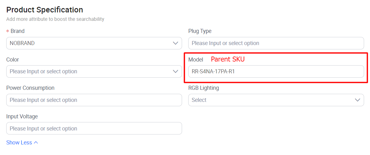 📌หมายเหตุ: ไฟล์ที่ได้จาก Lazada จะไม่มีช่อง Parent SKU ต้องใส่ Parent SKU ลงในช่อง Model ภายใต้ Product Specification ใน Lazada Seller Center หากเป็นสินค้าเดี่ยวที่ไม่มีตัวเลือก ให้ใส่ SKU เดียวกันใน Seller SKU และ ช่อง Model