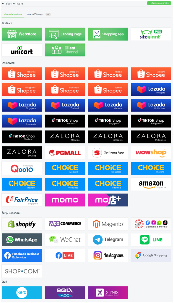 ขั้นตอนที่ 1: เชื่อมต่อช่องทางการขายทั้งหมดเข้ากับ SiteGiant สามารถดูวิธีการเชื่อมต่อได้จากคู่มือ How To Connect Sales Channels