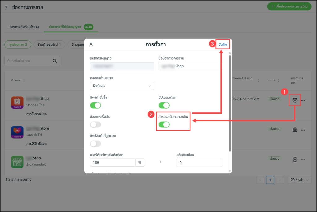 ขั้นตอนที่ 2: หากเชื่อมต่อกับ Shopeeให้คลิกไอคอนฟันเฟือง แล้วเปิดใช้งานตัวเลือก “สำรองสต็อกแคมเปญ” (Reserve Campaign Stock) เพื่อช่วยติดตามสต็อกคงเหลือ และป้องกันการขายเกิน