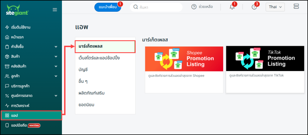 ขั้นตอนที่ 3: ไปที่เมนู แอป > มาร์เก็ตเพลส > Shopee หรือ TikTok Promotion Listing (Apps > Marketplaces > Shopee/TikTok Promotion Listing) เพื่อซิงค์ข้อมูลโปรโมชั่นกลับจากมาร์เก็ตเพลส
