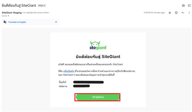 ขั้นตอนที่ 1: ตรวจสอบอีเมลที่มีหัวข้อว่า “ยินดีต้อนรับสู่ SiteGiant” หากไม่พบในกล่องจดหมายเข้า กรุณาลองในอีเมลขยะหรือสแปม คลิกปุ่มสีเขียวในอีเมลเพื่อเปิดใช้งานบัญชี