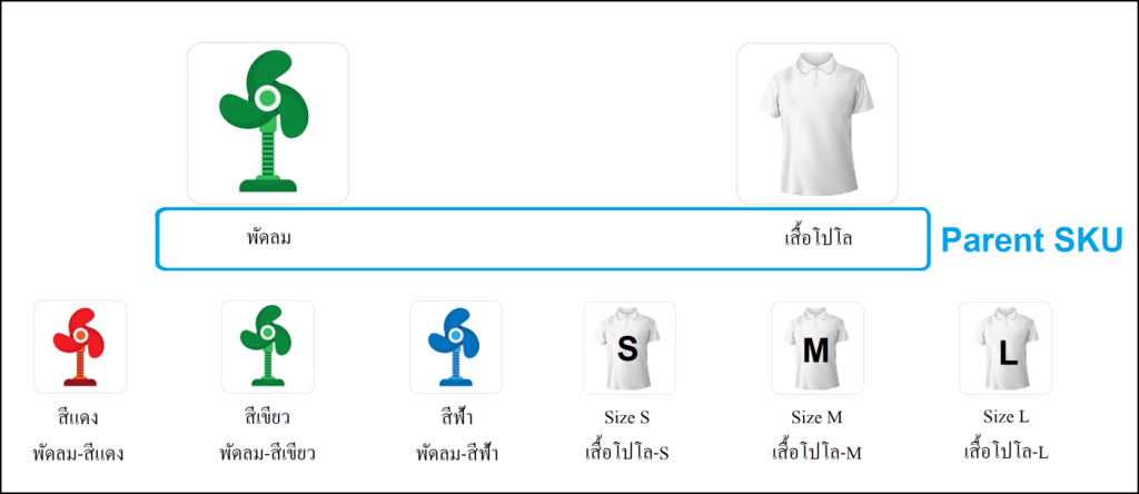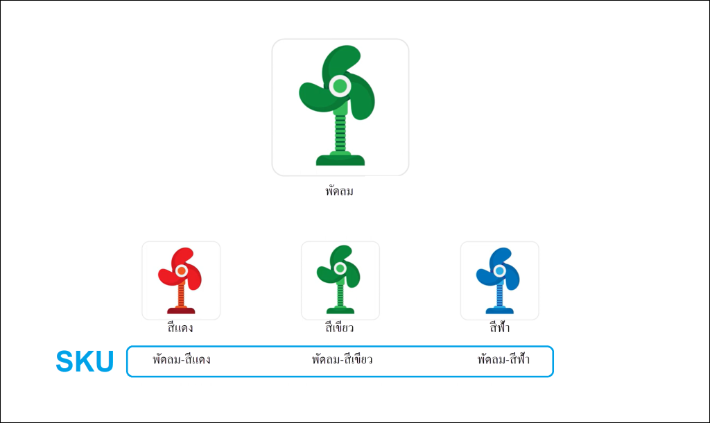 • ตัวอย่าง: ขายพัดลม USB สีแดง เขียว น้ำเงิน ต้องตั้ง SKU แยกต่างหากสำหรับแต่ละสี