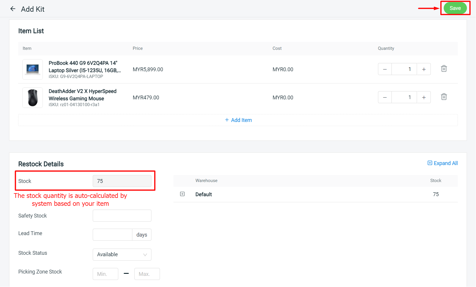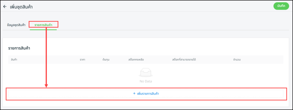 ขั้นตอนที่ 3: ไปที่แท็บ Item List > กด + Add Item เพื่อเพิ่มสินค้าที่อยู่ในชุด
