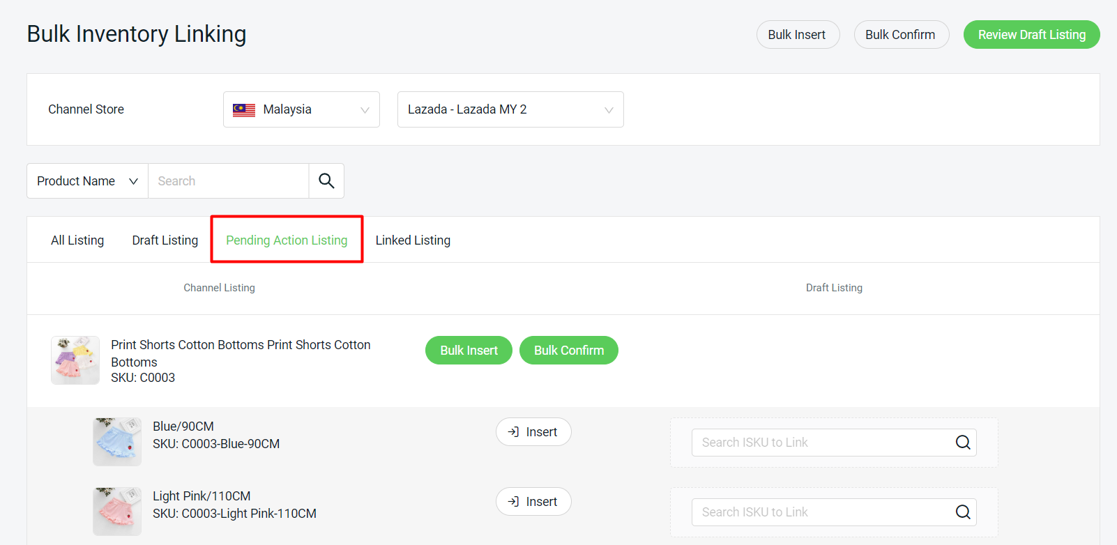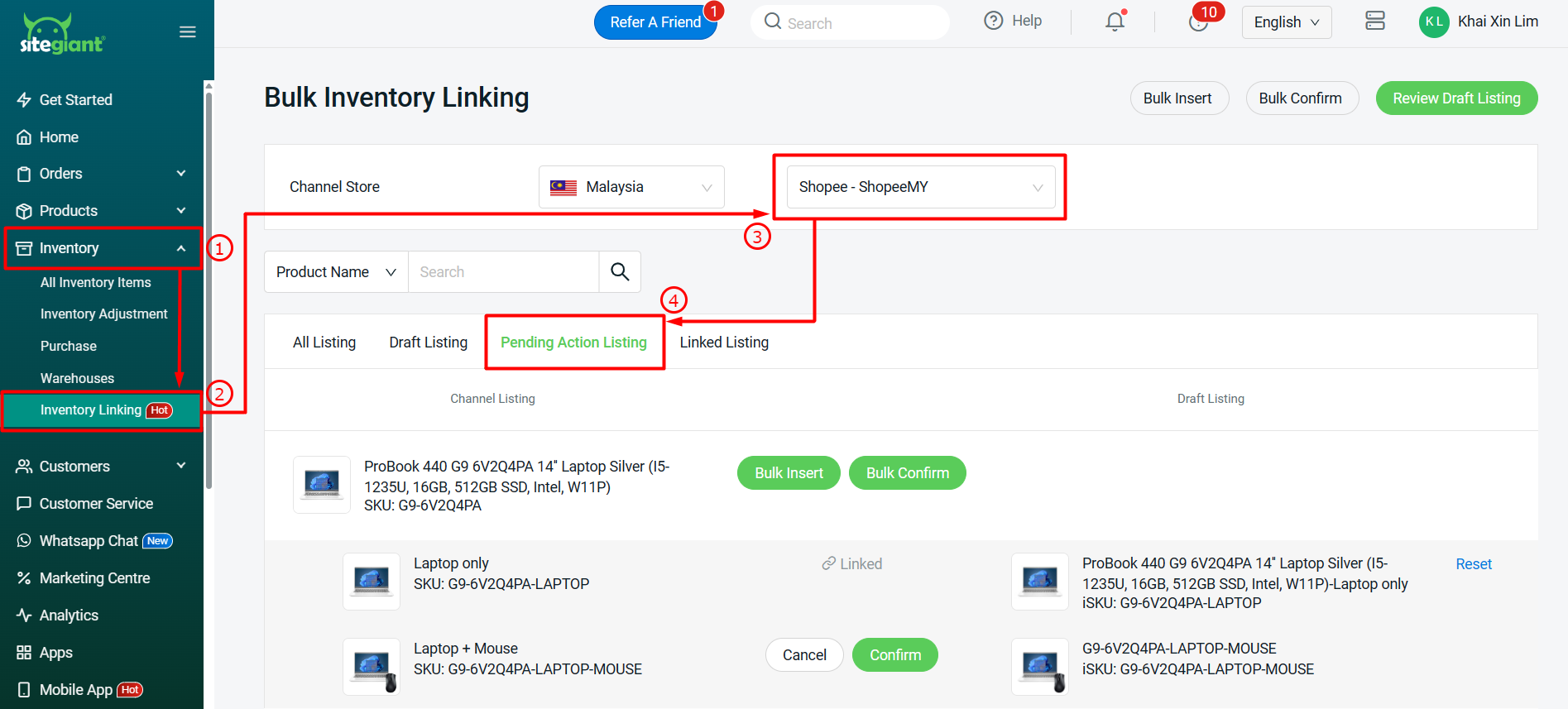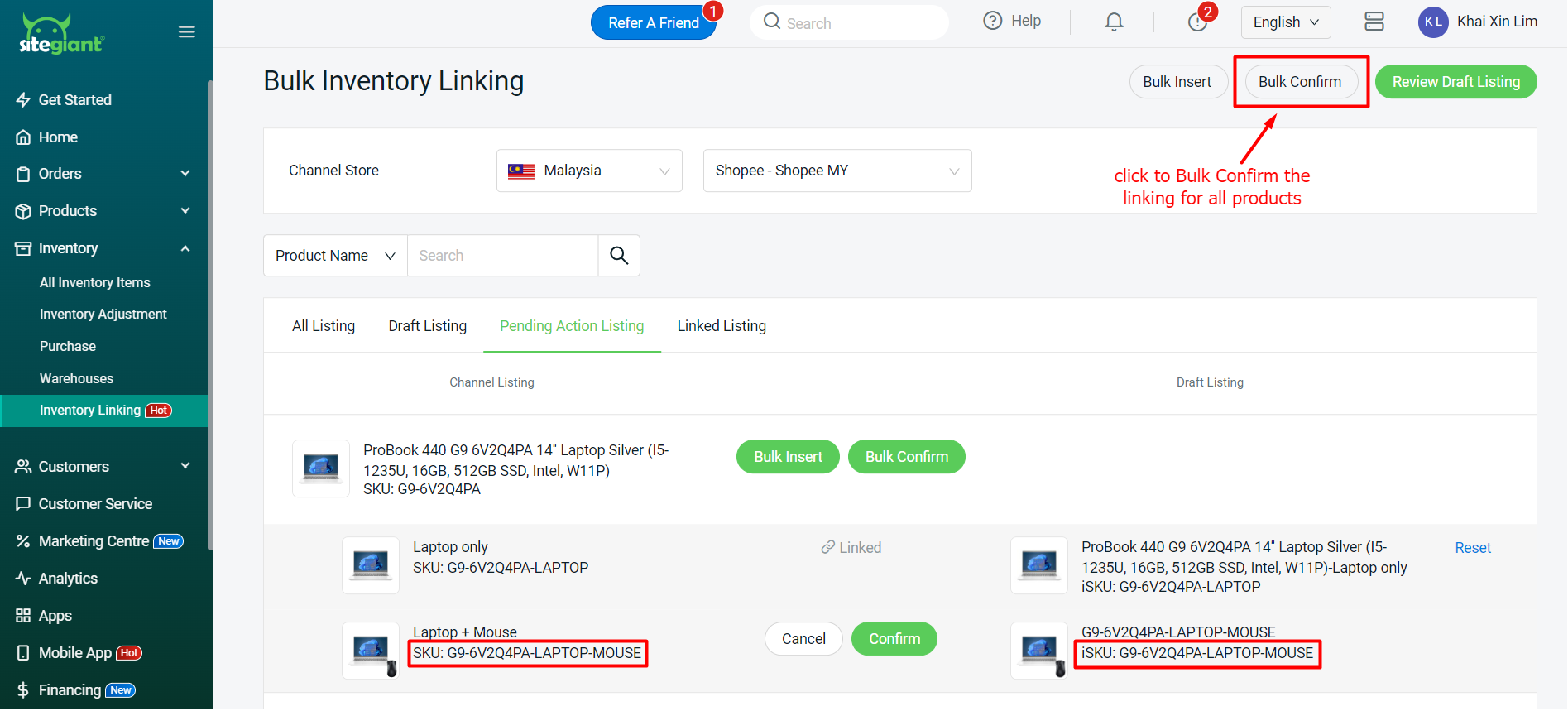 ขั้นตอนที่ 1: หลังจากสร้างชุดสินค้า (Kit) เรียบร้อยแล้ว ให้กลับไปที่ Inventory Linking > เลือกร้านหลักที่คุณได้เลือกในขั้นตอนก่อนหน้านี้ > ไปที่แท็บ Pending Action Listing