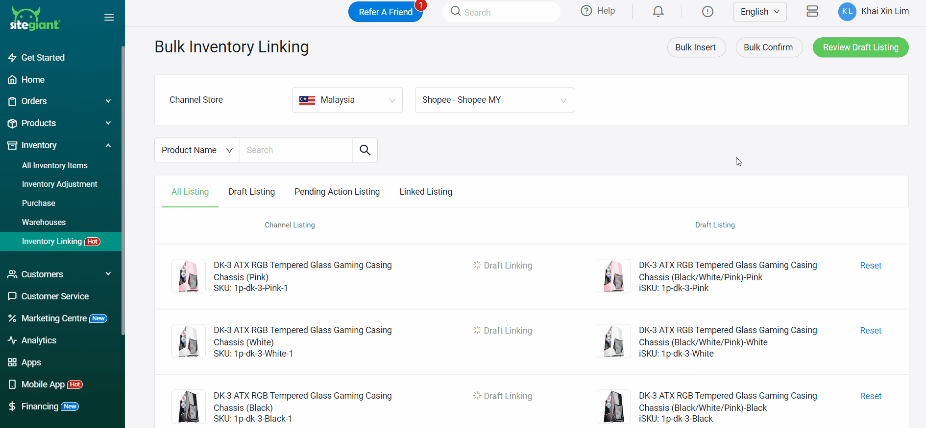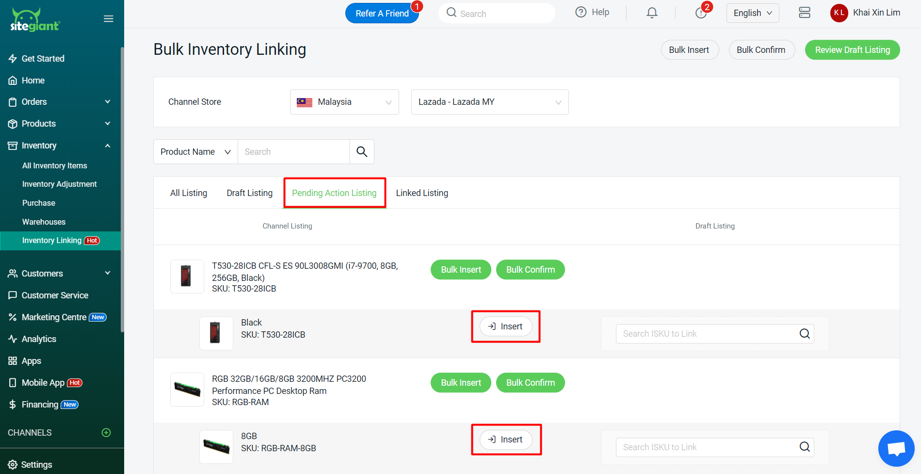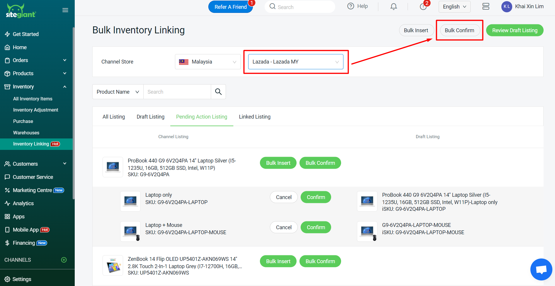 ขั้นตอนที่ 1: หลังจากสร้างชุดสินค้า (Kit) เรียบร้อยแล้ว ให้กลับไปที่ Inventory Linking > เลือกร้านหลักที่คุณได้เลือกในขั้นตอนก่อนหน้านี้ > ไปที่แท็บ Pending Action Listing