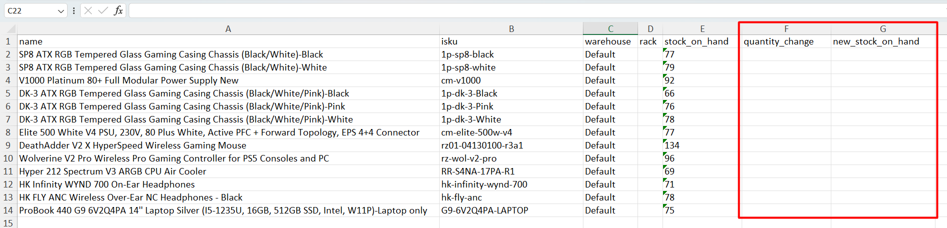 ขั้นตอนที่ 5: อัปเดตคอลัมน์ quantity_change หรือ new_stock_on_hand เพื่อปรับจำนวนสต็อกในระบบ หากสินค้าใดไม่มีการปรับสต็อก คุณสามารถลบรายการนั้นออกจากไฟล์ Excel หรือปล่อยทั้งสองคอลัมน์ไว้เปล่าก็ได้
