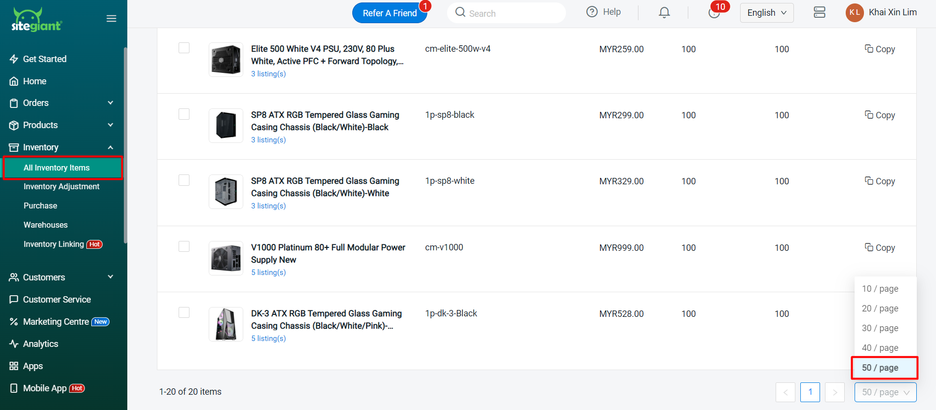 ขั้นตอนที่ 1: ไปที่ All Inventory Items > เลื่อนลงมาล่างสุด > เปลี่ยนหน้าให้แสดง 50 รายการ