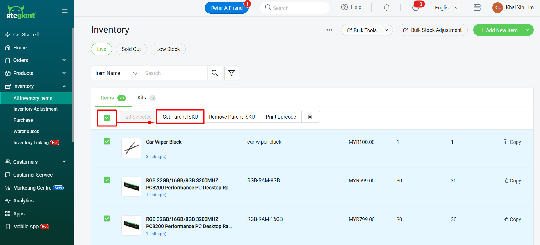 ขั้นตอนที่ 2: เลือกสินค้าทั้งหมด (ไม่เกิน 50 รายการต่อครั้ง) > กด Set Parent iSKU