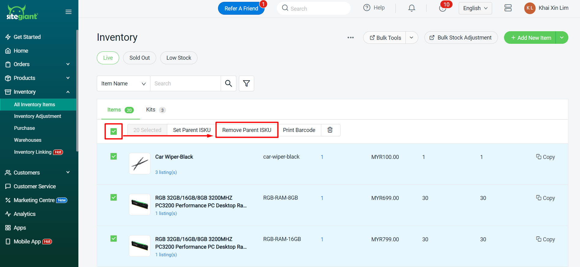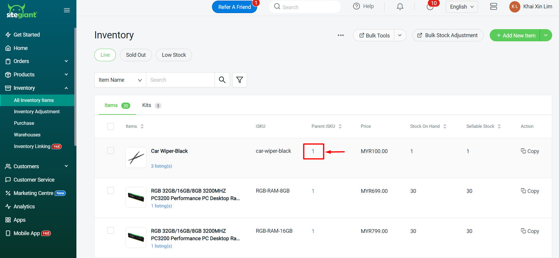 หลังจากดำเนินการเชื่อมโยงสินค้ากับสต็อกแบบกลุ่ม (Bulk Inventory Linking) และปรับยอดสต็อกเรียบร้อยแล้ว คุณอาจพบว่าจำนวนสต็อกในมาร์เก็ตเพลสยังไม่ตรงกัน หรือยอดสต็อกที่ปรับใหม่ยังไม่อัปเดตไปยังมาร์เก็ตเพลส ดังนั้น คุณจำเป็นต้องดำเนินการคำสั่ง “ปรับยอดสต็อกทุกช่องทางให้ตรงกัน” (Tally All Channels Inventory) เพื่อซิงค์ข้อมูลสต็อกล่าสุดจาก SiteGiant ไปยังทุกช่องทางที่เชื่อมโยงไว้